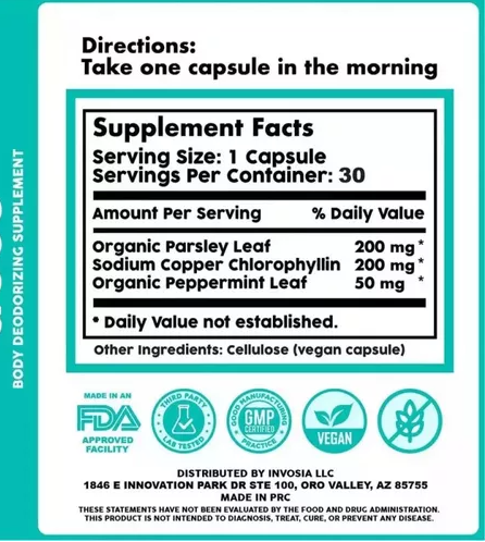 🔹 Clorofila (Cloruro de Hemo): Pigmento verde natural con propiedades purificantes que ayuda a mejorar el olor corporal y la salud digestiva.